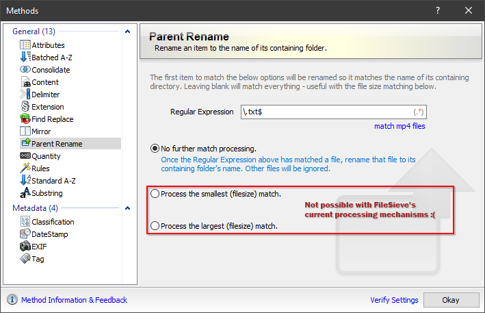 It turns out that I never released a Parent Rename plugin with FileSieve - I could've sworn I had. In fact, checking the source code, while I may have started the plugin, the Process() method (in the programming sense, not FileSieve's Method sense) is completely empty. The project date stamp for Parent Rename appears to be 2013 (!?), so I wonder if the plugin didn't progress due to a limitation within FileSieve at the time? |